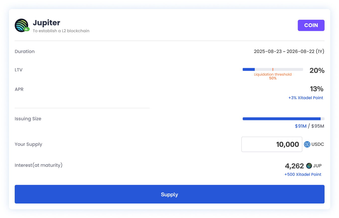 For example, Jupiter may issue a Coin Type LTT to raise $100M with a 13% interest rate (with 5% LP Allocation). Upon maturity, investors receive their principal and interest in $JUP tokens, based on a fixed quantity determined at the time of issuance. Let’s assume the price of $JUP is 0.305 USDC when the LTT is issued. An investor who supplies 10,000 USDC would receive 4,262 JUP as interest at maturity, along with their principal.