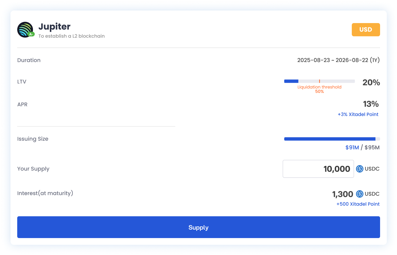 The USD Type is also zero-coupon structure offered on Xitadel platform, where investors receive a fixed amount of stablecoin as interest at maturity. This format is designed to provide stable and predictable returns for investors who prefer to avoid the volatility of native tokens.