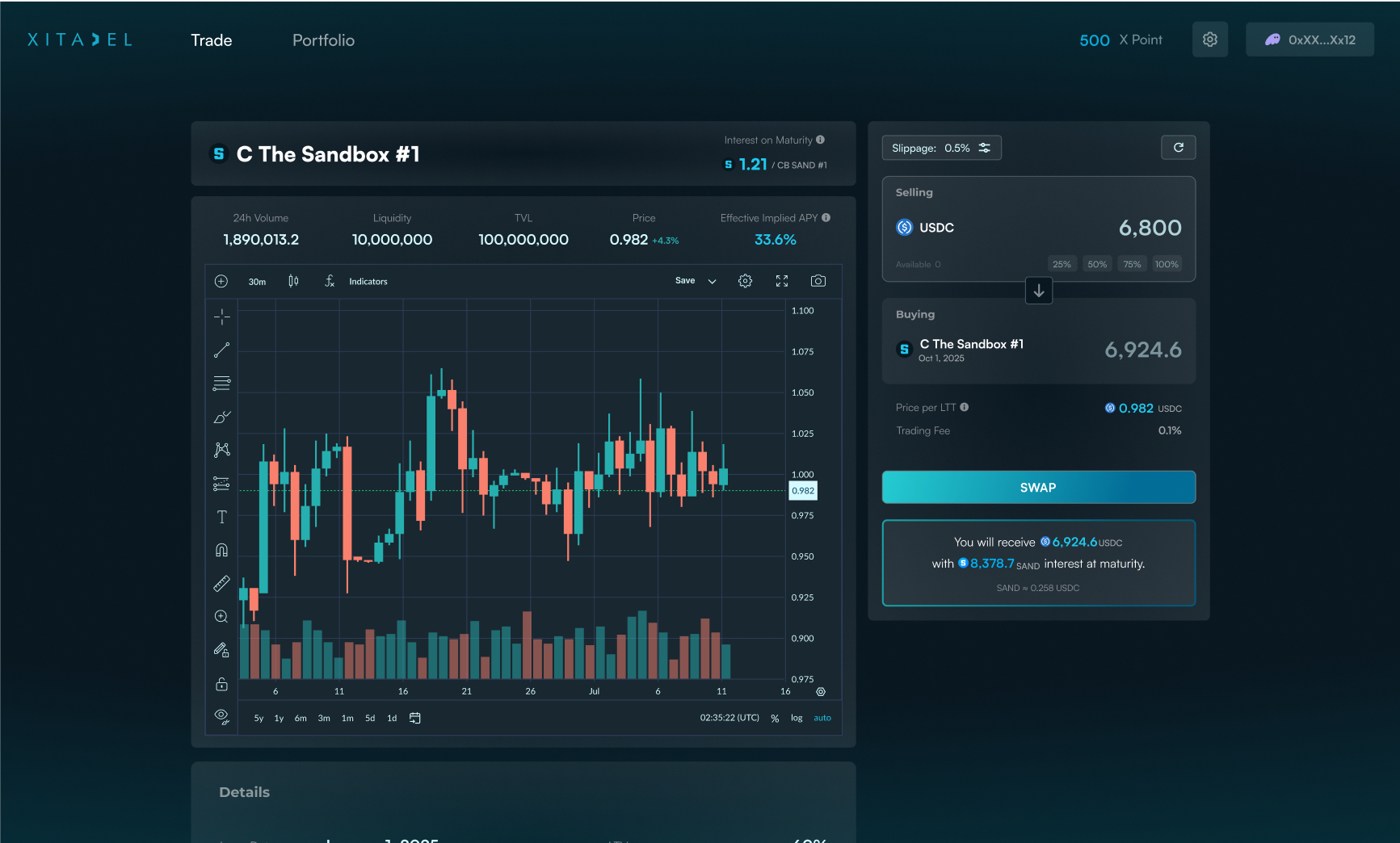 Xitadel builds DEX market into every LTT issuance by utilizing slice of tokens is paired with an equal value of stablecoins in an AMM liquidity pool, letting investors trade LTTs at market-driven prices.