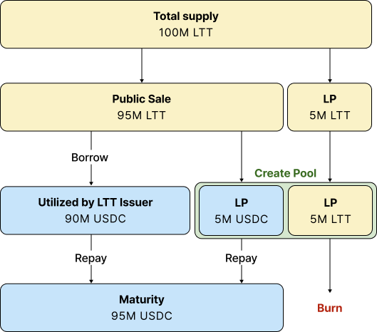 With that 5% allocation, Xitadel sells the remaining 95% of LTTs to investors and deposits the 5% slice plus an equal value of stablecoins into the LP. Because each LTT redeems for principal and interest at maturity, pool prices track yield, time to maturity, and perceived credit quality in real time.